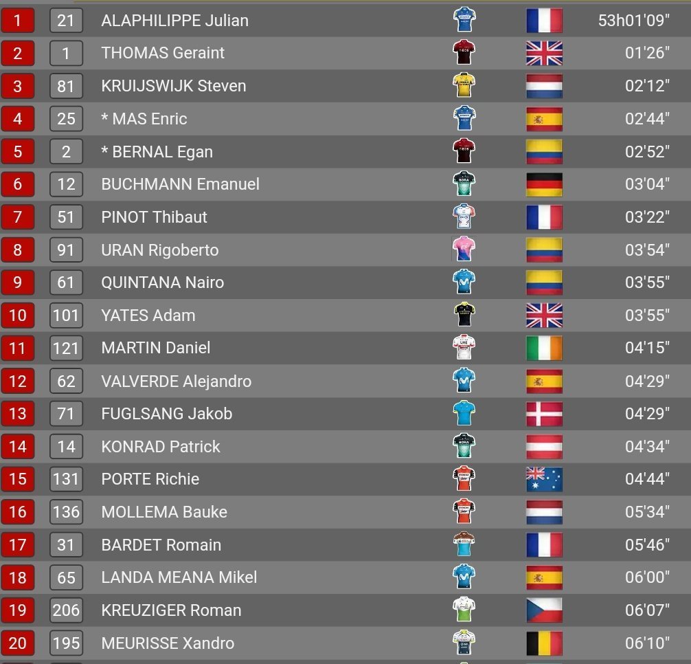Julian Alaphilippe manda en este Tour. El francés, enfundado en su maillot amarillo, despejó todas las dudas sobre si hoy aguantaría con la preciada prenda. No sólo salvó su ventaja sino que la aumentó con respecto a un Geraint Thomas que ahora es segundo en la general. Entre los españoles brilló Enric Mas, que se situó como uno de los mejores escaladores en meta para ser ya 4º en la clasificación general. El Tour está más abierto que nunca.